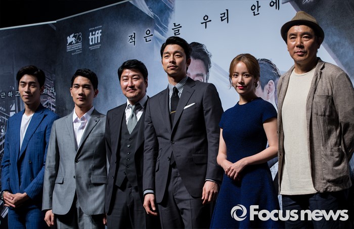 (서울=포커스뉴스) 배우 신성록(왼쪽부터), 엄태구, 송강호, 공유, 한지민, 김지운 감독이 4일 오전 서울 강남구 압구정 CGV에서 열린 영화 '밀정' 제작보고회에 참석해 포즈를 취하고 있다. 배우 송강호, 공유, 한지민, 엄태구, 신성록 등이 출연하는 영화 '밀정'은 일제 강점기 무장독립단체 의열단과 일본 경찰 간의 암투를 그린 작품으로 오는 9월 개봉 예정이다.