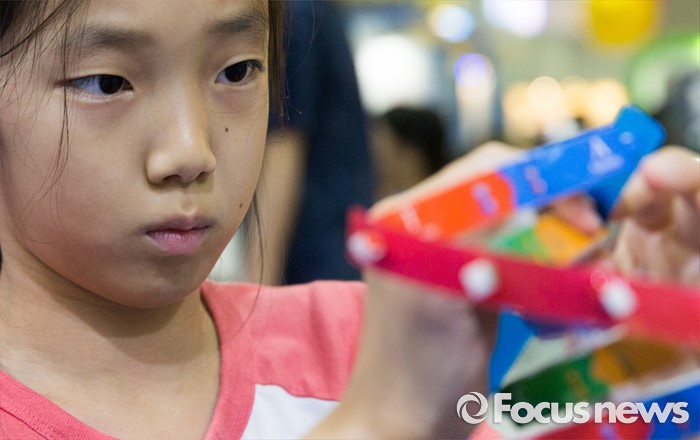 (서울=포커스뉴스) 4일 오전 서울 강남구 코엑스에서 열린 '제20회 대한민국 과학창의축전'을 찾은 한 시민이 원소 모형을 만들고 있다.