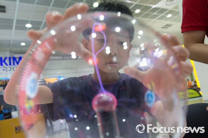 (서울=포커스뉴스) 4일 오전 서울 강남구 코엑스에서 열린 '제20회 대한민국 과학창의축전'을 한 시민이 플라즈마볼을 만지고 있다.