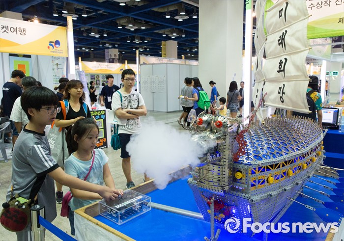 (서울=포커스뉴스) 4일 오후 서울 강남구 코엑스에서 열린 '제20회 대한민국 과학창의축전'을 찾은 시민들이 과학교구로 만든 거북선을 바라보고 있다.