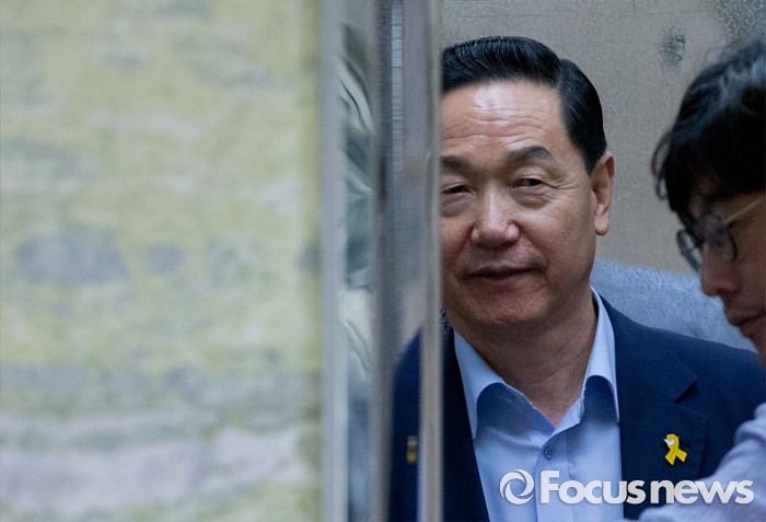 (서울=포커스뉴스) 전당대회 출마를 김상곤 더불어민주당 전 혁신위원장이 4일 오후 서울 여의도 국회 정론관 앞에서 취재진 질문에 답한 뒤 다음 일정으로 이동하기 위해 승강기에 오르고 있다.