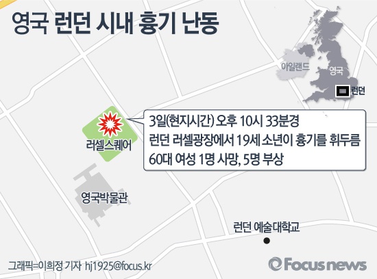 (서울=포커스늇,) 영국 BBC는 3일 오후 10시33분쯤 런던 중심부에 위치한 러셀광장에서 19세 소년이 사람들을 향해 흉기를 휘둘렀다고 보도했다. 소년의 칼부림에 60대 여성 한 명이 숨졌으며, 여성 2명과 남성 3명 등 5명이 다쳤다.