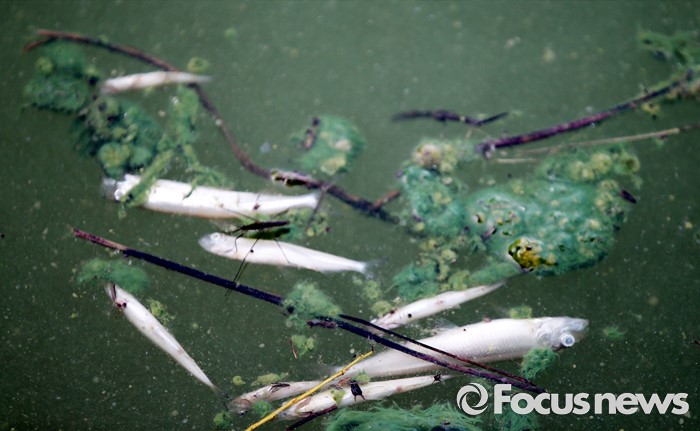 (청주=포커스뉴스) 폭염이 이어지면서 대청호 수역에 조류경보 '관심' 단계가 내려진 가운데 4일 오후 충북 청주시 상당구 문의대교 인근 대청호에 물고기 수 백마리가 폐사돼 있다.