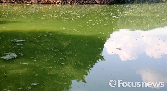 (청주=포커스뉴스) 폭염이 이어지면서 대청호 수역에 조류경보 '관심' 단계가 내려진 가운데 4일 오후 충북 청주시 상당구 문의대교 인근 대청호에 녹조가 형성돼 있다.