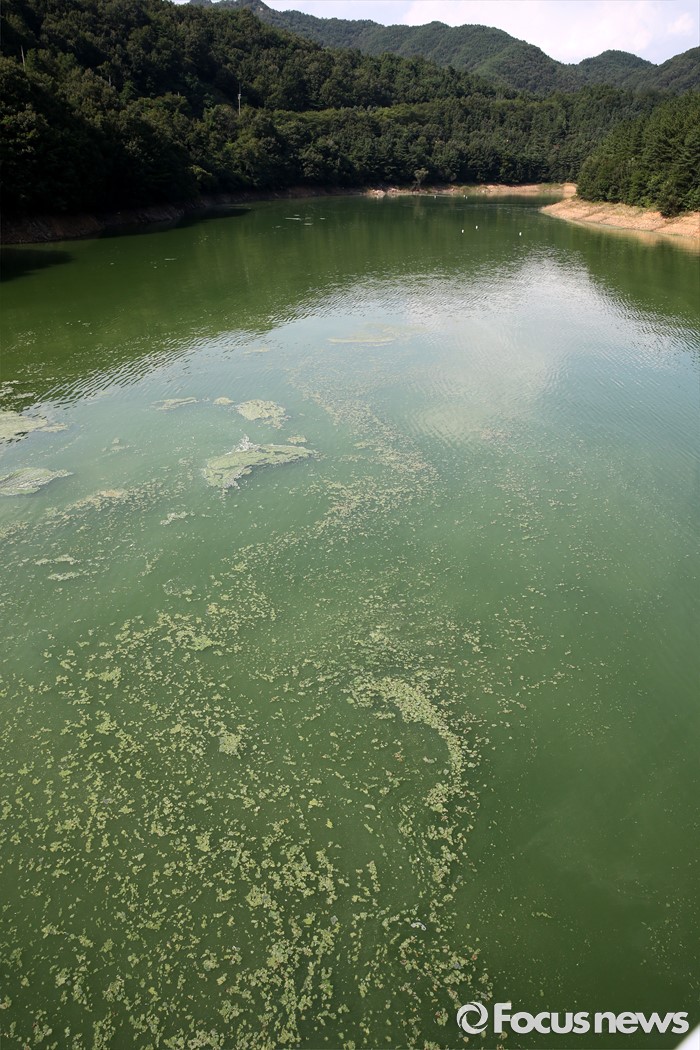 (청주=포커스뉴스) 폭염이 이어지면서 대청호 수역에 조류경보 '관심' 단계가 내려진 가운데 4일 오후 충북 청주시 상당구 문의대교 인근 대청호에 녹조가 형성돼 있다.