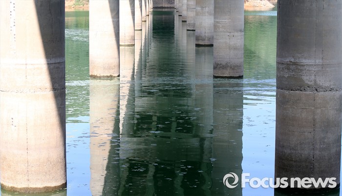 (청주=포커스뉴스) 폭염이 이어지면서 대청호 수역에 조류경보 '관심' 단계가 내려진 가운데 4일 오후 충북 청주시 상당구 문의대교 인근 대청호에 녹조가 형성돼 있다.