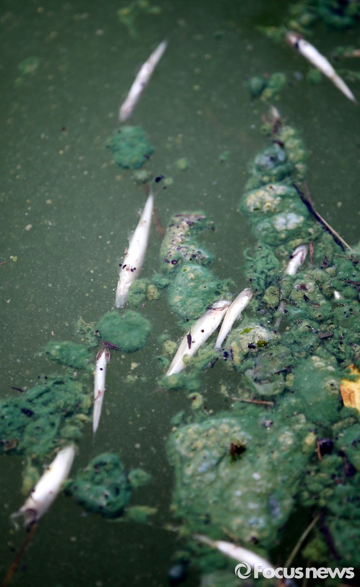 (청주=포커스뉴스) 폭염이 이어지면서 대청호 수역에 조류경보 '관심' 단계가 내려진 가운데 4일 오후 충북 청주시 상당구 문의대교 인근 대청호에 물고기 수 백마리가 폐사돼 있다.