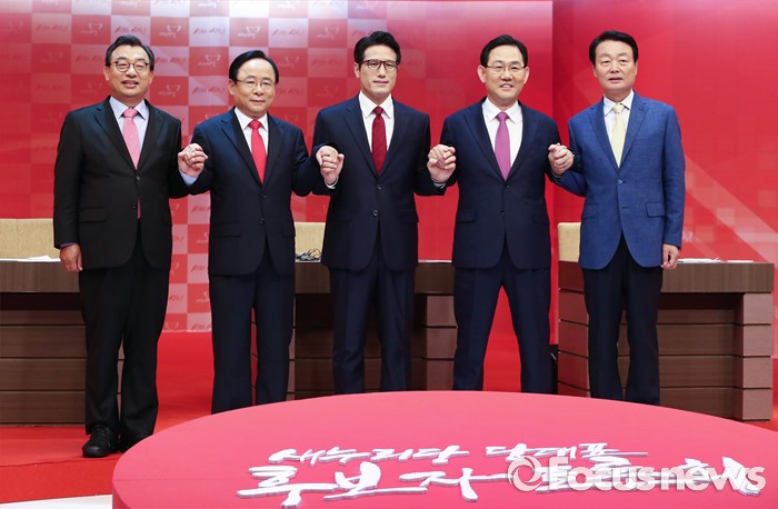 (서울=포커스뉴스) 4일 오후 서울 강서구 등촌동 SBS공개홀에서 새누리당 대표 경선 4차 TV토론회을 마친 의원들이 포즈를 취하고 있다. 오른쪽부터 한선교, 주호영, 정병국, 이주영, 이정현 의원.