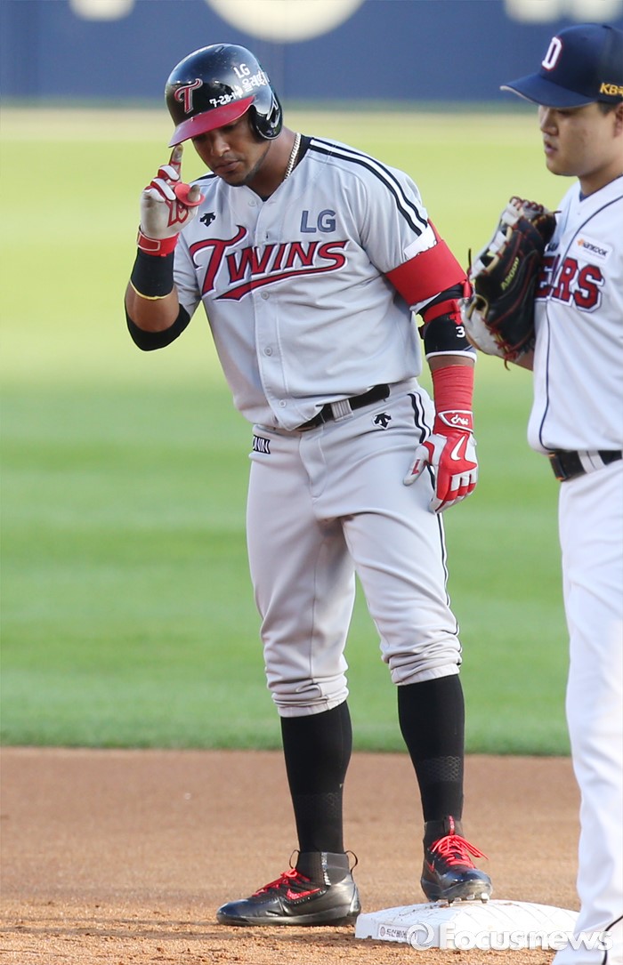 (서울=포커스뉴스) 4일 서울 잠실구장에서 열린 2016 프로야구 LG-두산 경기 1회초 2사 2루에서 LG 히메네스가 좌중간 2루타로 2루주자를 불러 들이고 세리머니를 하고 있다.