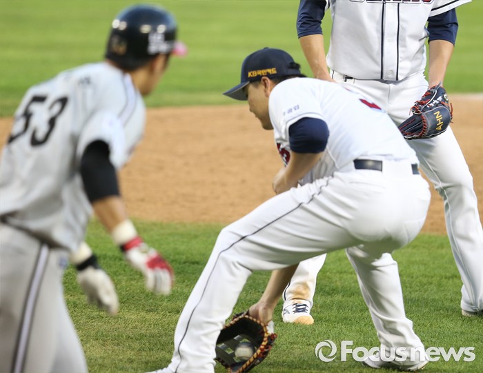 (서울=포커스뉴스) 4일 서울 잠실구장에서 열린 2016 프로야구 LG-두산 경기 4회초 무사 1,2루에서 두산 1루수 오재일이 LG 양석환의 보내기번트 타구를 잡고 있다.