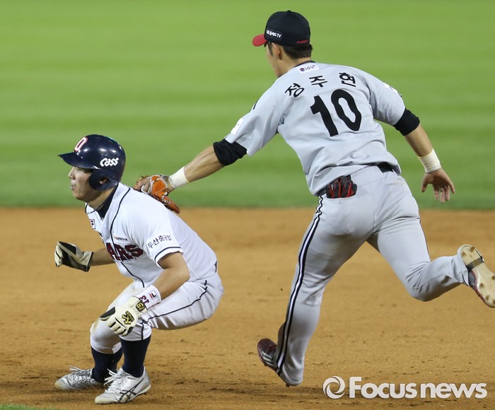 (서울=포커스뉴스) 4일 서울 잠실구장에서 열린 2016 프로야구 LG-두산 경기 6회말 동점타를 친 두산 허경민이 류지혁 타석때 견제구에 걸리며 LG 2루수 정주현에게 태그아웃되고 있다.