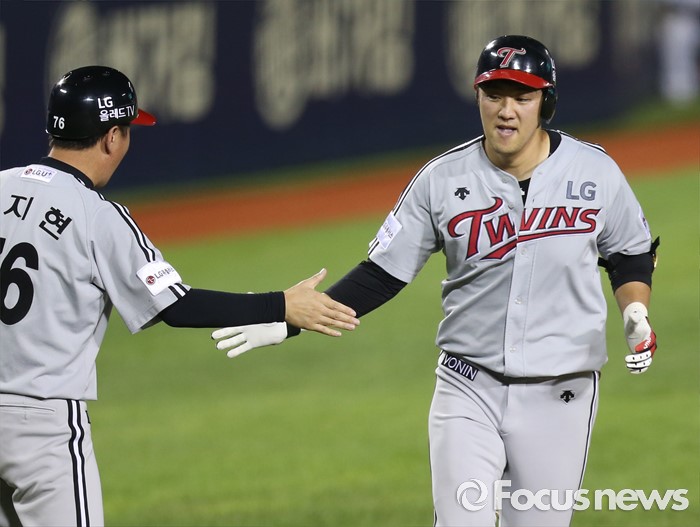 (서울=포커스뉴스) 4일 서울 잠실구장에서 열린 2016 프로야구 LG-두산 경기 8회초 1사후 LG 양석환이 중월 솔로 홈런을 치고 3루를 돌며 유지현 코치와 손바닥을 마주치고 있다.