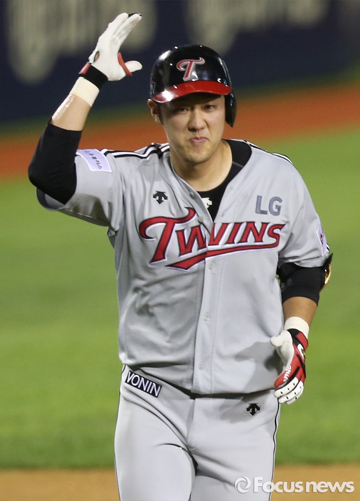 (서울=포커스뉴스) 4일 서울 잠실구장에서 열린 2016 프로야구 LG-두산 경기 8회초 1사후 LG 양석환이 중월 솔로 홈런을 치고 손을 들고 홈인하고 있다.