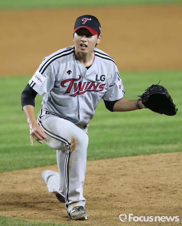 (서울=포커스뉴스) 4일 서울 잠실구장에서 열린 2016 프로야구 LG-두산 경기 8회말 2사 1루에서 LG 투수 이준형이 두산 허경민에게 투구 도중 넘어졌다 일어나고 있다.