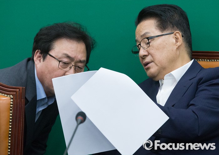 (서울=포커스뉴스) 5일 오전 서울 여의도 국회에서 열린 국민의당 비상대책위원회에 참석한 박지원(오른쪽) 비상대책위원장과 부좌현 수석사무부총장이 대화하고 있다.