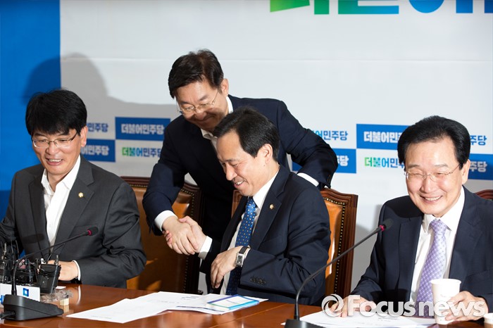 | △ 악수하는 우상호 원내대표-박범계 의원 |