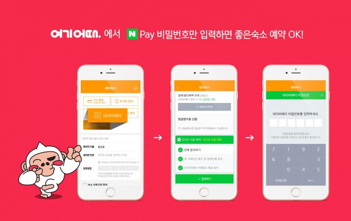 네이버페이 결제 수단 적용으로 '여기어때' 사용자는 '예약정보확인→결제하기→네이버페이 간편결제 비밀번호 입력' 등 3단계만 거치면 숙소 예약·결제를 간편하게 마칠 수 있다. 결제액의 일부는 '네이버페이 포인트'로 적립된다.