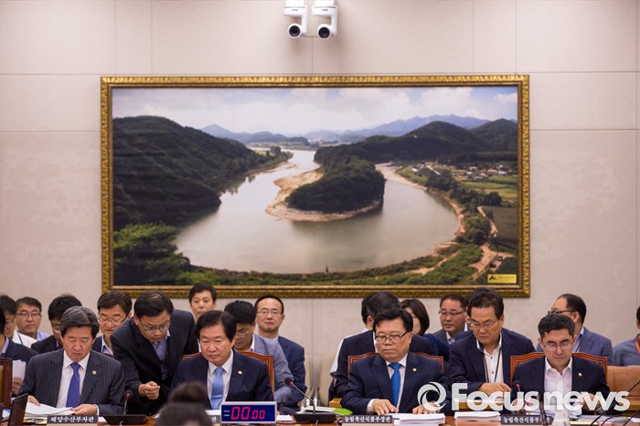 (서울=포커스뉴스) 김영석(왼쪽 두 번째) 해양수산부 장관과 이동필(오른쪽 두 번째) 농림축산식품부 장관이 5일 오전 서울 여의도 국회에서 열린 국회 농림축산식품해양수산위원회 전체회의에 참석해 회의 준비를 하고 있다.