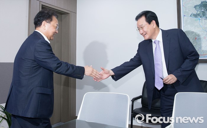 (서울=포커스뉴스) 5일 오전 서울 여의도 국회 의원회관에서 추경 예산 등 협조를 위해 방문한 유일호(왼쪽) 경제부총리 겸 기획재정부 장관이 변재일 더불어민주당 정책위의장과 만나 인사하고 있다.