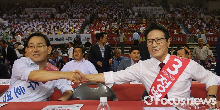 (천안=포커스뉴스) 5일 오후 충남 천안시 유관순체육관에서 열린 새누리당 대표 및 최고위원 선출 충청권 합동연설회에서 당대표에 출마한 주호영(왼쪽) 후보와 정병국 후보가 악수를 하고 있다.