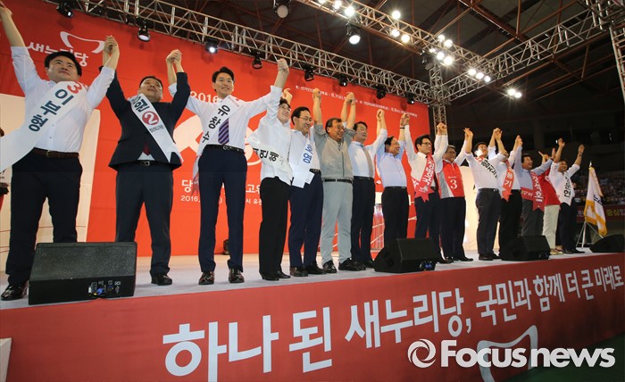 (천안=포커스뉴스) 5일 오후 충남 천안시 유관순체육관에서 열린 새누리당 대표 및 최고위원 선출 충청권 합동연설회에서 당대표 및 최고위원에 출마한 후보들이 당원들에게 인사하고 있다.