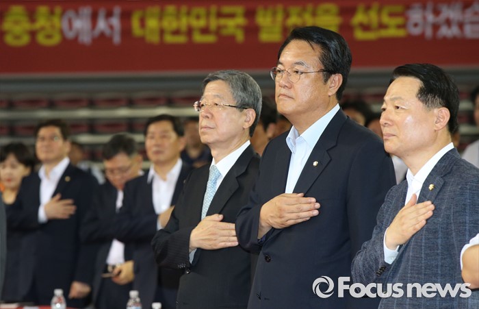 (천안=포커스뉴스) 5일 오후 충남 천안시 유관순체육관에서 열린 새누리당 대표 및 최고위원 선출 충청권 합동연설회에서 박찬우(오른쪽부터) 충남도당위원회, 정진석 원내대표, 김희옥 혁신비상대책위원장이 국이에 대한 경례를 하고 있다.