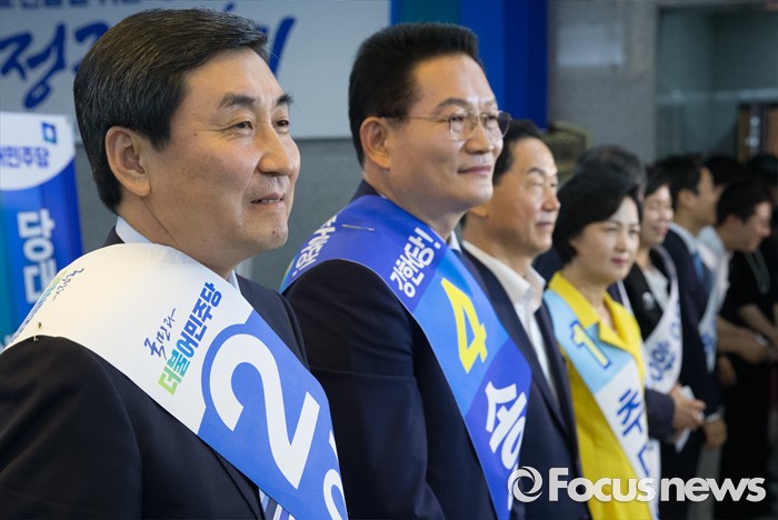 (서울=포커스뉴스) 5일 오후 서울 여의도 국회 의원회관에서 열린 더불어민주당 당대표 선출을 위한 예비경선대회에 참석한 이종걸(왼쪽부터), 송영길, 김상곤, 추미애 당대표 후보가 참석자들에게 지지를 호소하기 위해 기다리고 있다.