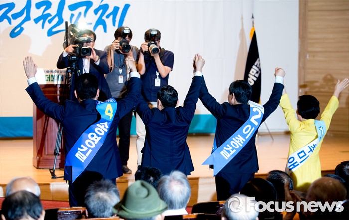 (서울=포커스뉴스) 5일 오후 서울 여의도 국회 의원회관에서 열린 더불어민주당 당대표 선출을 위한 예비경선대회에 참석한 송영길(왼쪽부터), 김상곤, 이종걸, 추미애 당대표 후보가 손을 들어 취재진을 향해 포즈를 취하고 있다.