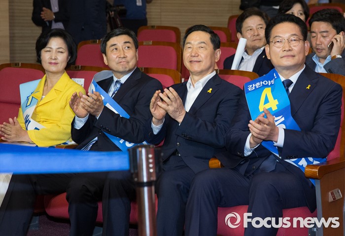 (서울=포커스뉴스) 5일 오후 서울 여의도 국회 의원회관에서 열린 더불어민주당 당대표 선출을 위한 예비경선대회에 참석한 추미애(왼쪽부터), 이종걸, 김상곤, 송영길 당대표 후보가 박수치고 있다.