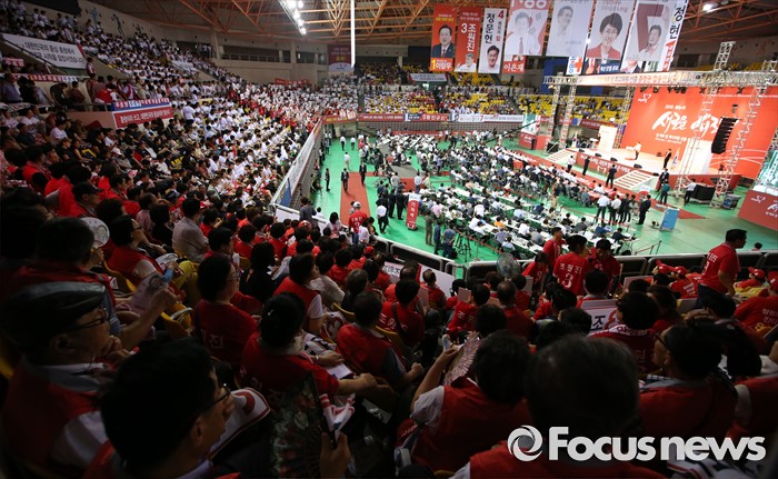 (천안=포커스뉴스) 5일 오후 충남 천안시 유관순체육관에서 열린 새누리당대표 및 최고위원 선출 충청권 합동연설회에서 다원들이 후보의 연설을 바라보고 있다.