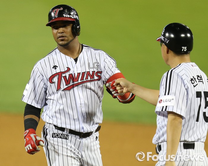 (서울=포커스뉴스) 5일 서울 잠실구장에서 열린 2016 프로야구 kt-LG 경기 4회말 2사 3루에서 LG 히메네스가 우전 적시타로 3루주자 김용의를 불러 들이고 1루에서 한혁수 코치와 주먹을 마주치고 있다.