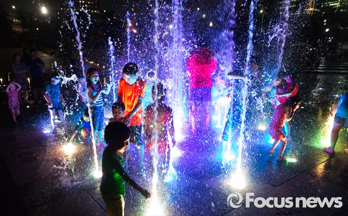 (서울=포커스뉴스) 폭염과 열대야가 지속되고 있는 5일 오후 서울 여의도 한강공원 내 물빛광장을 찾은 시민들이 물놀이를 하며 더위를 식히고 있다.