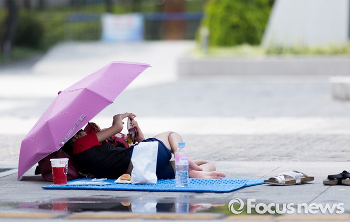 (서울=포커스뉴스) 절기상 입추인 7일 오후 서울 종로구 광화문 세종대로에 설치된 물놀이장에서 어린이들이 휴식을 취하고 있다.