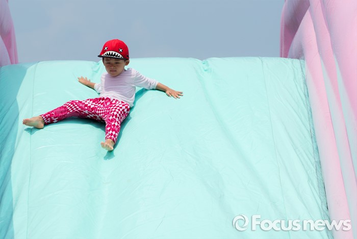 (서울=포커스뉴스) 절기상 입추인 7일 오후 서울 종로구 광화문 세종대로에 설치된 물놀이장에서 한 어린이가 미끄럼틀을 타며 즐거운 시간을 보내고 있다.