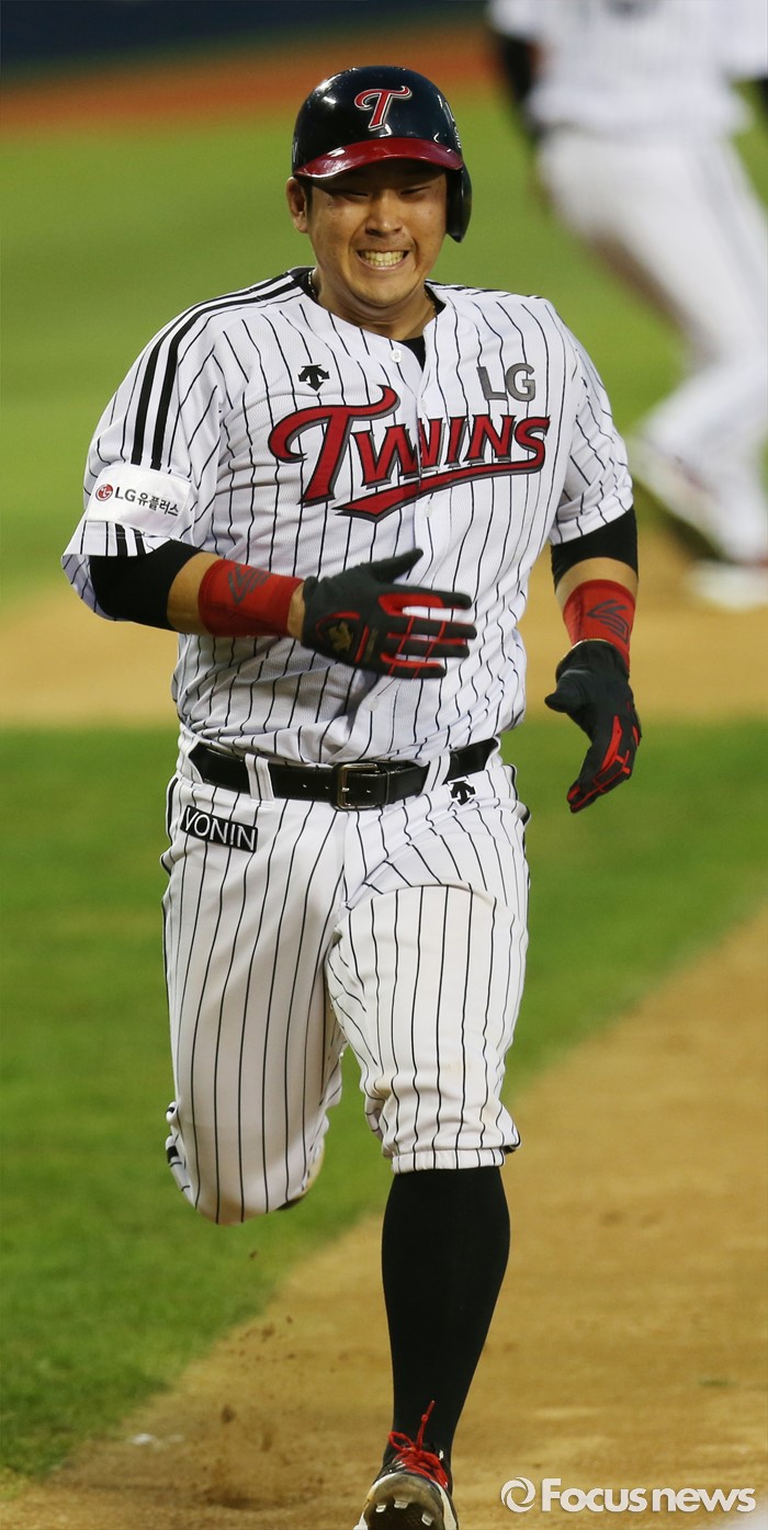 (서울=포커스뉴스) 5일 서울 잠실구장에서 열린 2016 프로야구 kt-LG 경기 4회말 2사 1,2루에서 LG 박용택의 우전 적시타떄 2루주자 유강남이 홈인하고 있다.
