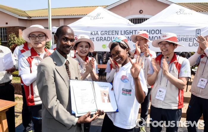 한편, 기아차는 현재 아프리카 탄자니아, 말라위,에티오피아, 모잠비크, 케냐, 우간다 등 6개국 9개 지역에서 그린 라이트 프로젝트를 진행하고 있으며, 향후 아프리카 대륙을 넘어 남미 지역 등에서도 실시할 예정이다.(왼쪽에서 두 번째) 말라위 교육부 관계자(senior inspector) Mr.Katona가 1회 졸업생인 Sirasinja(18)에게 졸업장를 전달하고 있는 모습. <사진제공=기아자동차>