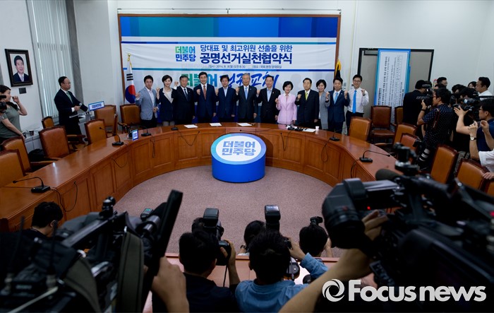 (서울=포커스뉴스) 8일 오전 서울 여의도 국회에서 열린 더불어민주당 당대표 및 부문별 최고위원 선출을 위한 공명선거 협약식에 참석한 당대표 및 최고위원 후보자들이 취재진을 향해 포즈를 취하고 있다. 왼쪽부터 이동학, 유은혜, 제정호 최고위원 후보, 이종걸 당대표 후보, 노웅래 선거관리위원장, 김종인 비대위 대표, 김상곤, 추미애 당대표 후보, 송현섭, 양향자, 김병관, 장경태 최고위원 후보.