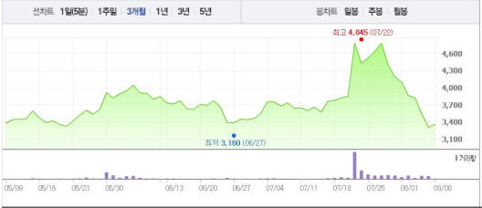 이는 일주일 전 주가인 1일(4100원)과 비교했을 때 18.29% 하락한 수치다.