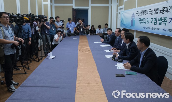 (서울=포커스뉴스) 8일 오전 서울 여의도 국회 귀빈식당에서 열린 조선 산업 발전과 조선 산업 노동자의 고용 안정을 위한 국회의원 모임 발족 기자회견에 참석한 의원들이 발언하고 있다. 왼쪽부터 김종훈 무소속 의원, 노회찬 정의당 원내대표, 박지원 국민의당 비상대책위원장, 김경수 더불어민주당 의원, 채이배 국민의당 의원.