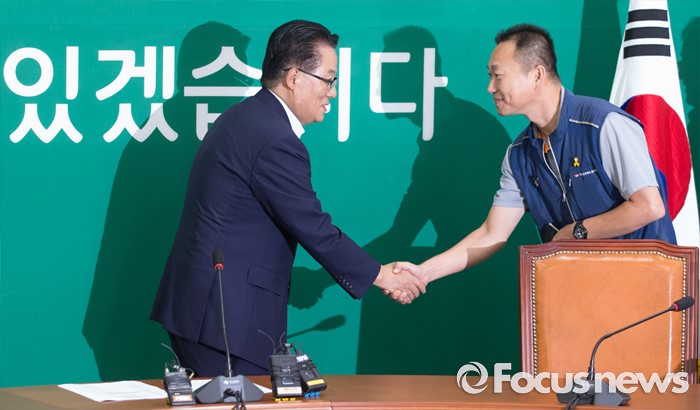 (서울=포커스뉴스) 박지원(왼쪽) 국민의당 비상대책위원장이 8일 오후 서울 여의도 국회에서 김주업 전국공무원노조 위원장과 면담에 앞서 인사하고 있다.
