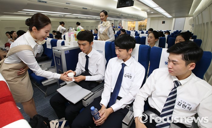 (대전=포커스뉴스) 8일 오후 대전 배재대학교에서 열린 제3회 예비승무원대회 예선에 참가한 고등학생들이 기내 서비스 교육을 받고 있다.