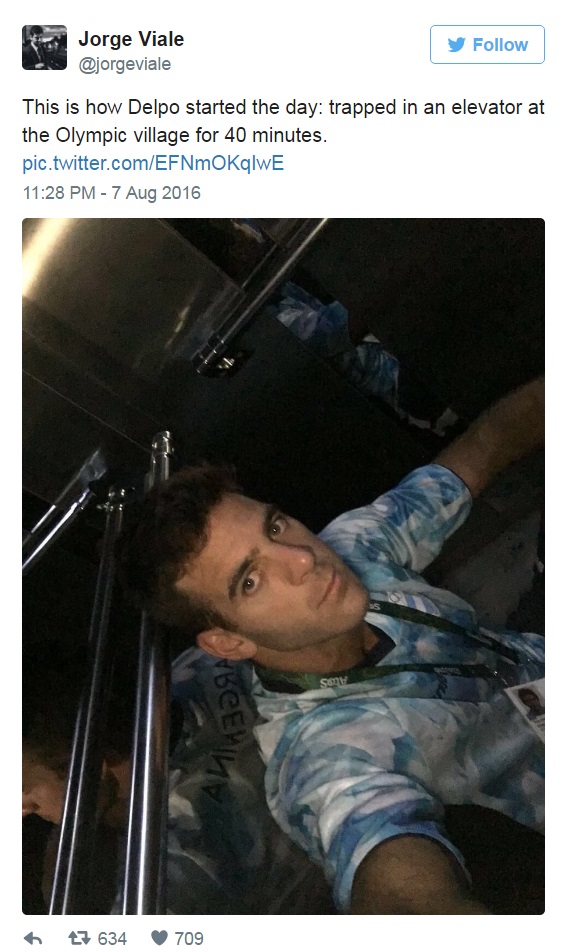 이날 경기는 그동안 금메달 획득이 예상됐던 조코비치 선수가 예선부터 탈락하면서 주목을 받았다.(리우데자네이루/브라질=게티/포커스뉴스) 후안 마르틴 델 포트로 아르헨티나 선수가 7일(현지시간) 브라질 리우데자네이루 올림픽 테니스 센터에서 열린 2016 리우 올림픽 남자 테니스 단식 1회전에서 남자 테니스 세계랭킹 1위 노박 조코비치 선수를 세트스코어 2대0으로 이겼다.2016.08.08 ⓒ게티이미지/이매진스 조지 바이엘 아르헨티나 테니스팀 언론 대변인은 7일(현지시간) 트위터를 통해 후안 마르틴 델 포트로 아르헨티나 테니스 선수가 브라질 리우데자네이루 올림픽 선수촌 엘리베이터에 40분간 갇혀있다 구조됐다고 알렸다. <사진출처=트위터>