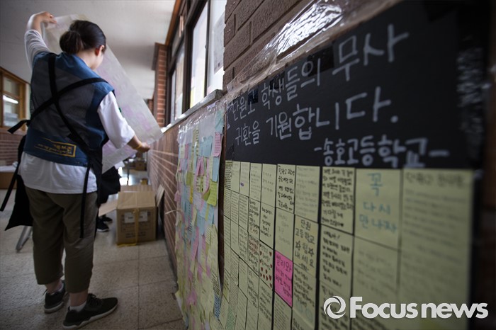 (안산=포커스뉴스) 세월호 참사에서 희생된 단원고등학교 학생들의 교실 이전 절차가 시작된 8일 오후 4.16 기억 저장소 관계자들과 자원봉사자들이 경기도 안산시 단원고등학교에서 교실 이전을 위한 준비 작업으로 '종이 유물 정리'를 하고 있다.