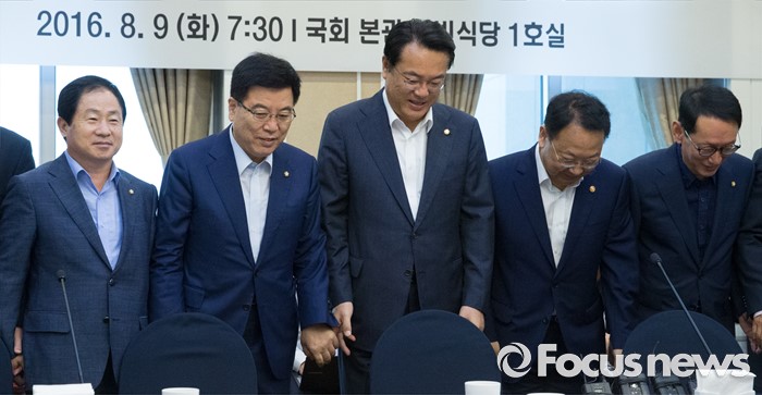 (서울=포커스뉴스) 9일 오전 서울 여의도 국회 귀빈식당에서 열린 2017년도 예산 당정협의에 참석한 정진석 새누리당 원내대표, 김광림 정책위의장과 유일호 경제부총리 겸 기획재정부 장관 등 참석자들이 취재진을 향해 포즈를 취한 뒤 인사하고 있다. 왼쪽부터 주광덕 예결위 간사, 김 정책위의장, 정 원내대표, 유 부총리, 김도읍 원내수석부대표.