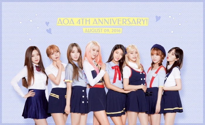 AOA(지민·초아·유나·유경·혜정·민아·설현·찬미)는 9일 자정 공식 트위터 계정을 통해 데뷔 4주년을 기념하는 사진을 업로드했다. 공개된 사진 속에는 오랜만에 선보이는 AOA 8명의 완전체 모습이 눈길을 사로잡는다.