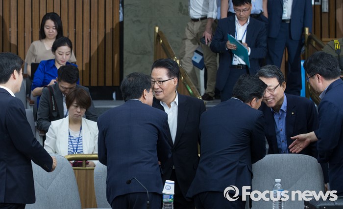 (서울=포커스뉴스) 9일 오전 서울 여의도 국회에서 열린 국민의당 의원총회에 참석한 박지원 비상대책위원장과 김성식 정책위의장 등이 의원들과 인사하고 있다.