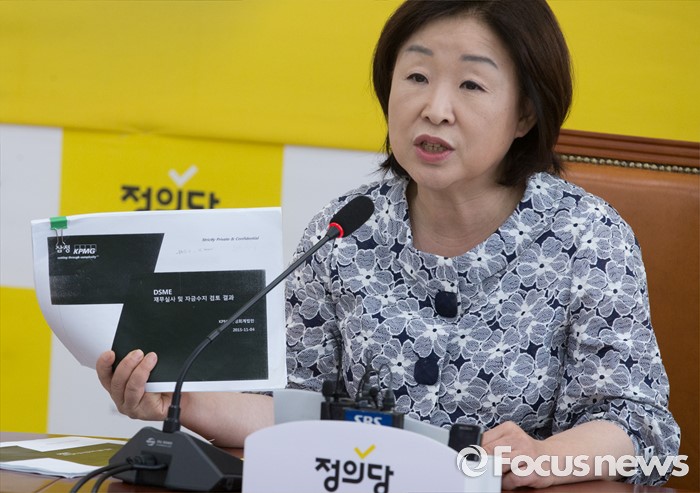 (서울=포커스뉴스) 9일 오전 서울 여의도 국회에서 심상정 정의당 상임대표가 대우해양조선 실사보고서 분석결과 발표 기자회견을 하고 있다.