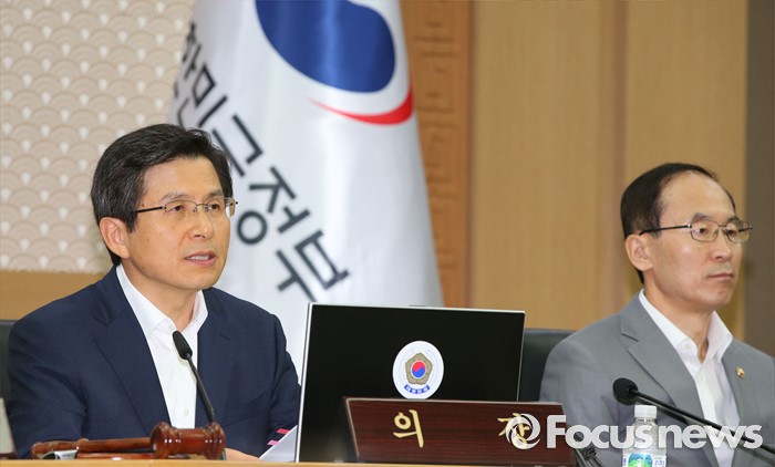 (세종=포커스뉴스) 황교안 국무총리가 9일 오전 세종시 정부세종청사 국무회의장에서 서울-세종 영상회의로 열린 국무회의를 주재하고 있다. 오른쪽은 윤성규 환경부장관.