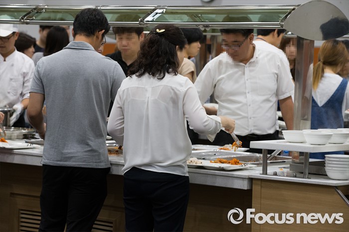 (서울=포커스뉴스) 수도권 대부분 지역에 엿새째 폭염경보가 내려진 9일 오전 서울 중구 한 구내식당이 직원들로 붐비고 있다.