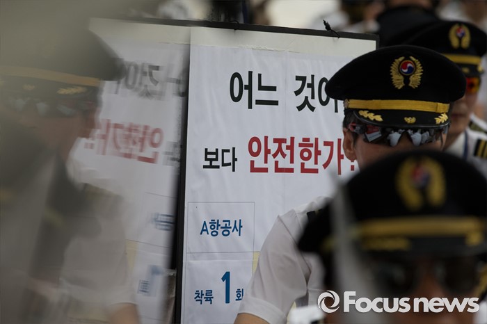 (서울=포커스뉴스) 9일 오후 서울 종로구 서울지방국세청 앞에서 열린 대한항공 경영정상화를 위한 세무조사 촉구대회에서 대한항공 조종사 노동조합 조합원들이 사회자의 발언을 듣고 있다.